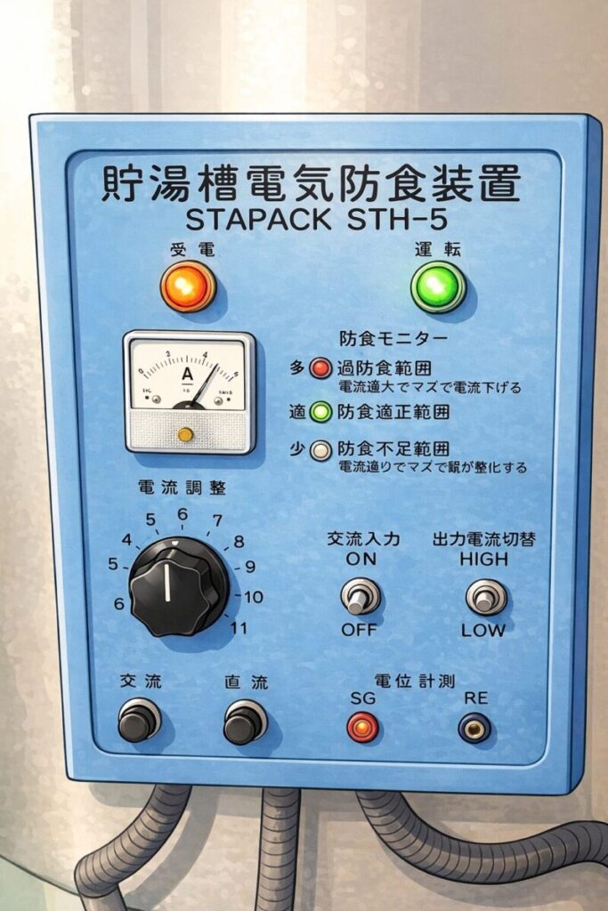 貯湯槽の電気防食装置は、タンクに微弱な電流を流すことで腐食を防ぐ設備です。