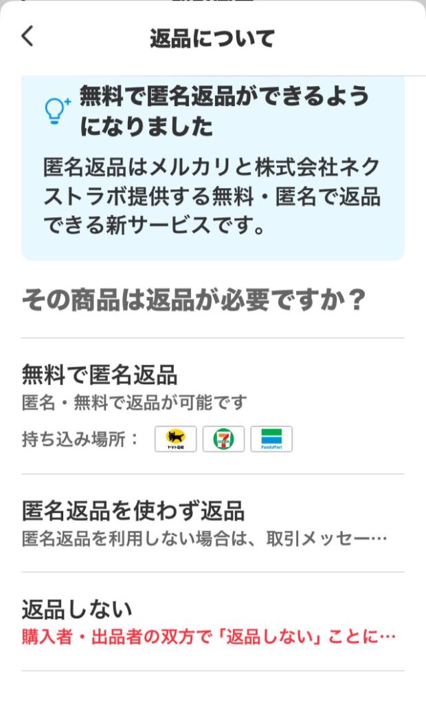 この画面には、匿名返品がメルカリと提携先のサービスで、無料・匿名で返品できる新サービスであることも案内されていました。